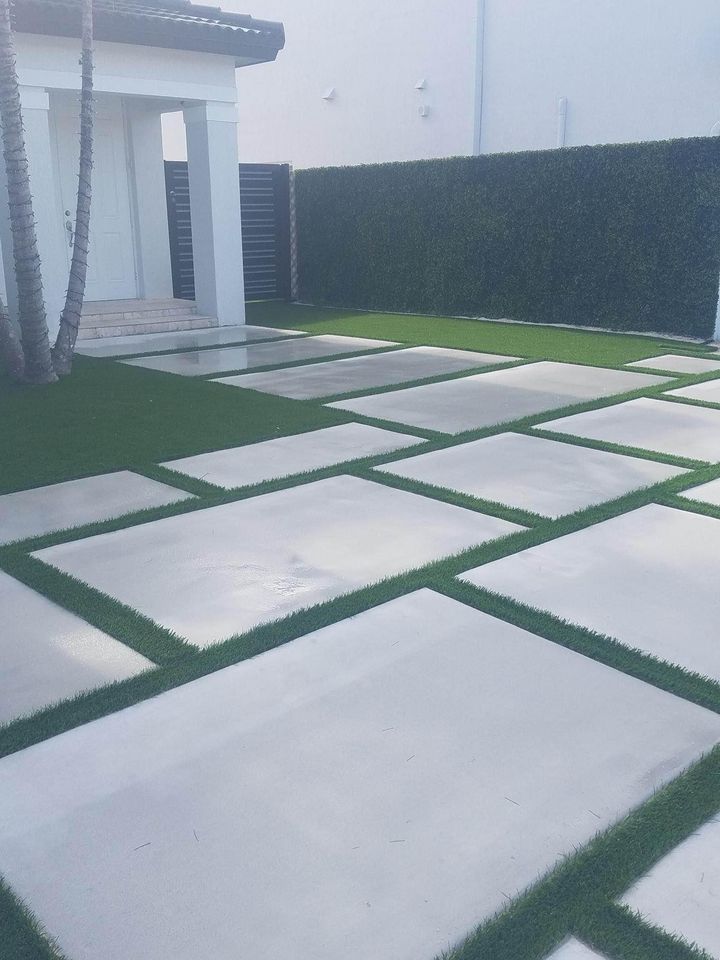 This style has been popping up more around West Palm Beach neighborhoods. Instead of one solid slab, we install spaced concrete squares with artificial grass in between.